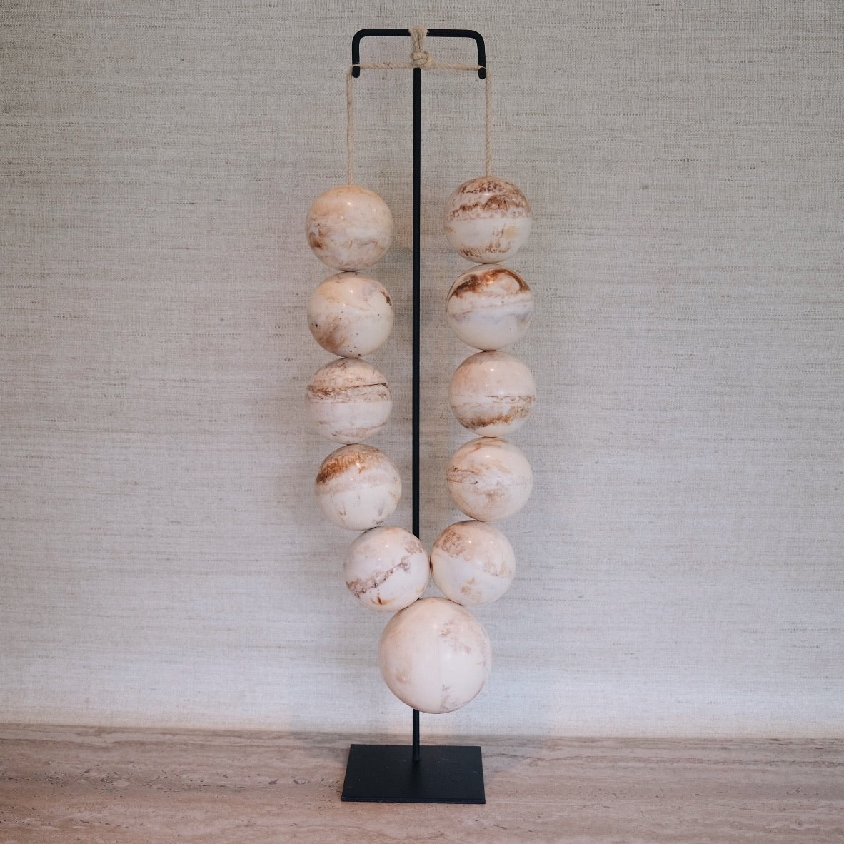 Ontdek de perfecte balans tussen elegantie en karakter met deze unieke decoratieve ketting op standaard. Een opvallend statement piece dat elke ruimte transformeert en een vleugje persoonlijkheid toevoegt aan je interieur. De ketting is opgebouwd uit 11 grote kralen, is prachtig opzichzelfstaand maar ook gaaf te combineren met de grotere variant of andere decoratieve items.
